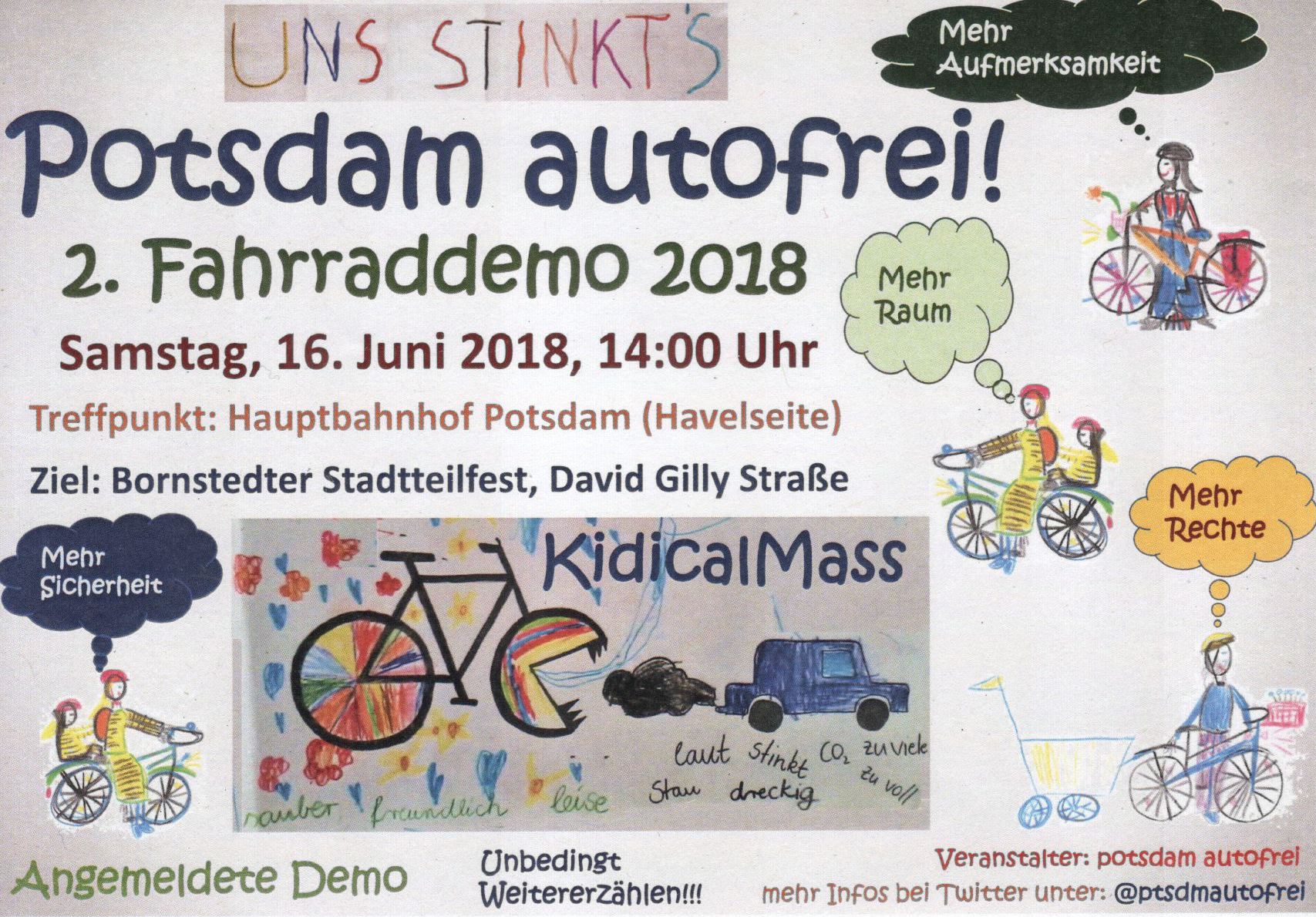 Es ist wieder soweit, potsdam autofrei! startet in die Saison mit einer familienfreundlichen Fahrraddemo. Wir demonstrieren für eine konsequent umgesetzte Verkehrswende in Potsdam und mehr Platz für Fuß-, Fahrrad- und öffentlichen Verkehr. Die Fahrraddemo endet um 15 Uhr in der Feuerbachstraße, in der wir den ersten Erlebnisraum einer autofreien Straße demonstrieren werden. Wir möchten verdeutlichen, dass Straßen als öffentlicher Raum dienen müssen und nicht von stinkenden und gefährlichen Autos dominiert werden dürfen. Die Fahrraddemo ist angemeldet und die Straßen sind frei für Kinder, Familien und alle, die sich eine lebenswertere Stadt wünschen.