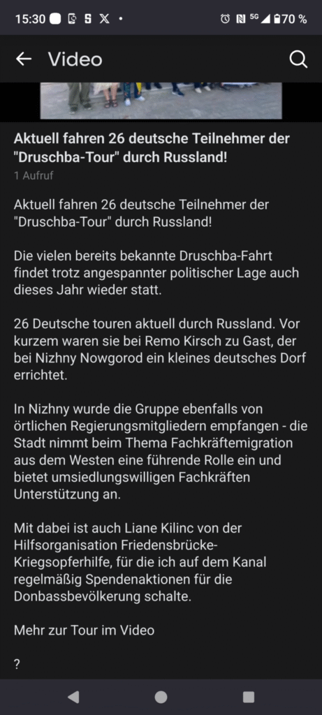Und Referentin Andrea Drescher ist bis heute aktives Mitglied des Vereins Friedensbrücke Kriegsopferhilfe. Vorstand dieses Vereins ist Liane Kilinc. Der Verein hat mit Sach- und Geldspenden prorussische Milizen im Ukraine-Krieg unterstützt. Liane Kilinc hat sich der deutschen Justiz durch eine Flucht nach Russland entzogen. Dort arbeitet sie u.a. mit Remo Kirsch zusammen, beim Neusiedlerprojekt in Nishni-Nowgorod. Es liegen Haftbefehle gegen die Vorsitzende und ein weiteres Vereinsmitglied vor. Es gab 2025 Durchsuchungen durch die Generalbundesanwaltschaft in mehreren Orten in Brandenburg.