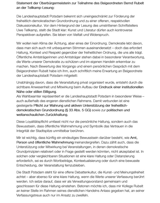 Trotzdem würden wir uns wünschen, das Frau Aubel in Zukunft deutlich politisch Position bezieht – auch in Personalangelegenheiten und nicht nur, wenn es um AFD und rechte Gewalt, sondern auch um rechten Kulturkampf geht – mitten in Potsdam.
