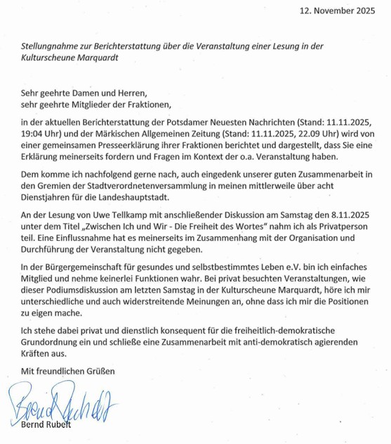Ich finde es äußerst befremdlich, den Kultur- und Heimatverein in die Nähe rechter Ideologien zu stellen. Dieser Verdin steht für die Stärkung des Zusammenlebens in Marquardt. Ich habe in den vielen Jahren, die ich in Marquardt gelebt habe, nicht feststellen können, dass dort solches Gedankengut gefördert wird. Ihr Bericht wirft unberechtigterweise ein schlechtes Bild auf Marquardt.