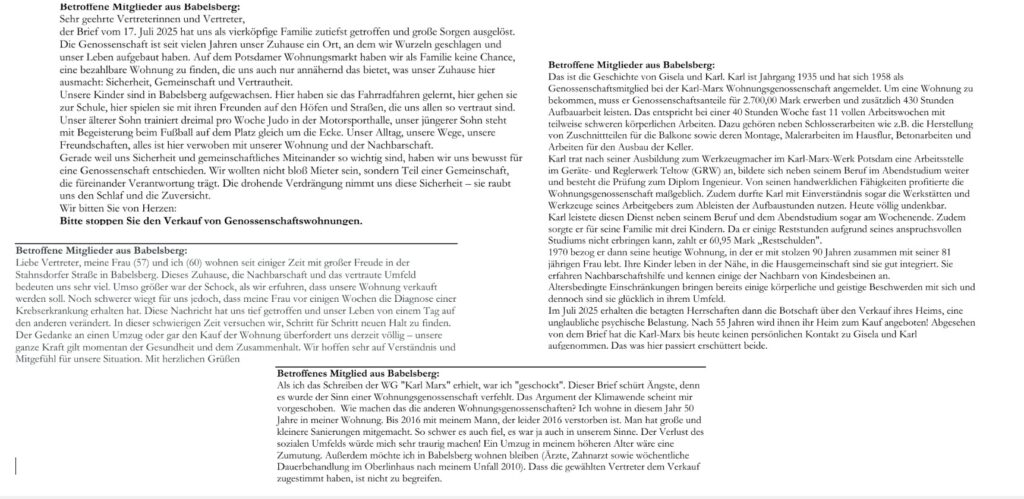 Am 17.07.2025 änderte sich das Leben von mindestens 700 Potsdamern und Potsdamerinnen schlagartig. Sie alle erhielten einen Brief von ihrem Vermieter, der Wohnungsgenossenschaft „Karl Marx“ Potsdam eG, in dem ihnen mitgeteilt wurde, dass ihre Wohnungen verkauft werden sollen.